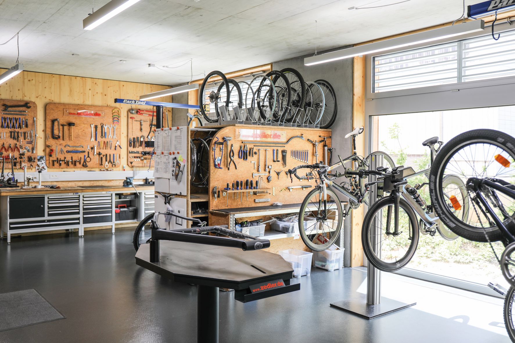 Dieser Bereich kann in Abhängigkeit der Räumlichkeiten auch die attraktive Anlaufstelle werden, an dem die größeren Inspektionen angenommen werden. Dort wird beim zuvor per Mail oder Telefon vereinbarten Anlieferungstermin das Fahrrad mit dem Kunden besprochen und durchgecheckt, um für intern das Arbeitsvolumen zu planen und dem Kunden schon eine Indikation mitzugeben, welche Kosten er für die gesamte Instandsetzung zu erwarten hat.